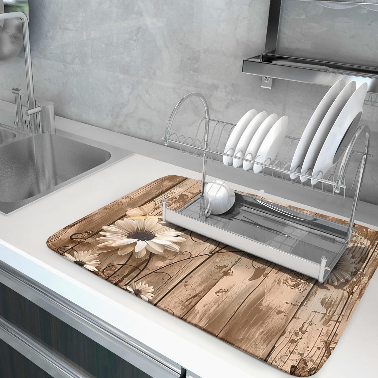 Summer Daisy Flowers Dish Drying Mat for Kitchen Counter 16x18in Rustic Wood Floral Kitchen Mat Daisy Microfiber Absorbent Dish Drainer Mat Fast Dry Kitchen Accessories Dishes Pad for Countertops