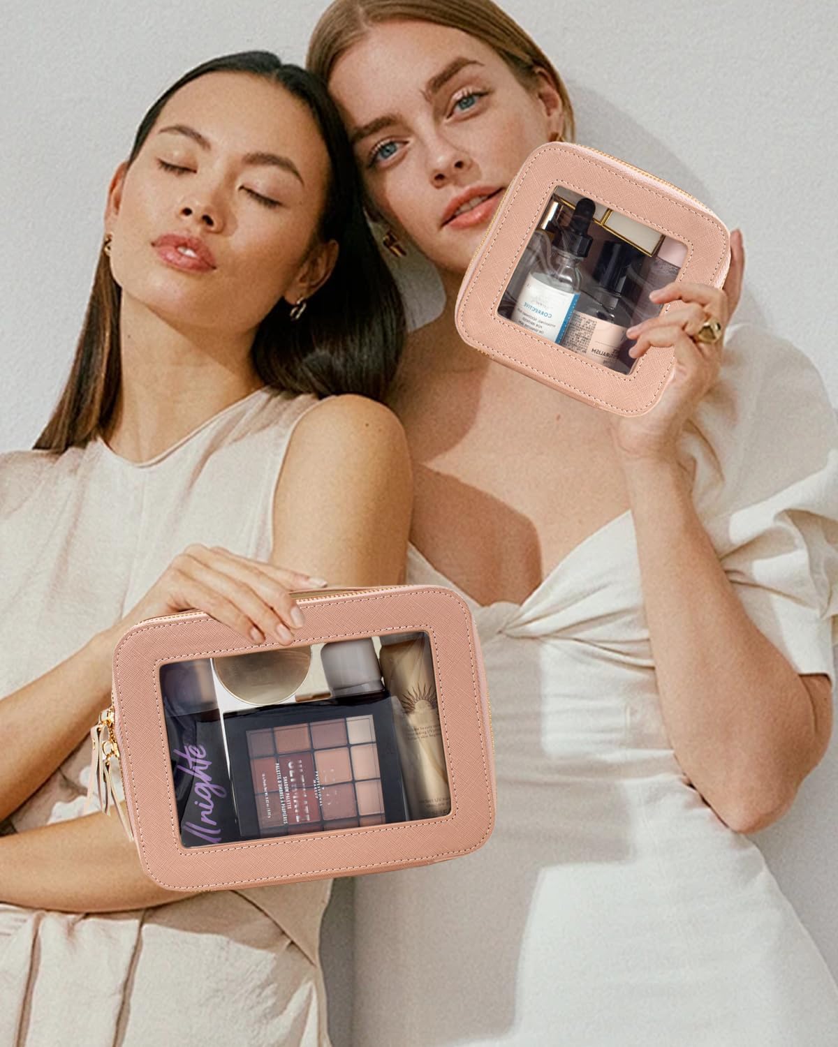 • Clear Design: Our 2Pcs Travel Makeup Bag is elegant ,and stylish, this makeup travel organizer was designed in a minimalist boxy shape,is sleek and minimalistic look for your makeup accessories collection. And is designed with a transparent PVC window,all items are clear at a glance, and you can quickly choose the cosmetics you need.Portable and lightweight Slip it into your purse, backpack, everyday tote or travelling bag for easy access to your must-have items. Large Size:8.1'' x 6.1'' x2.5'', Mini Size:5.1'' x 4.8''x 2''.