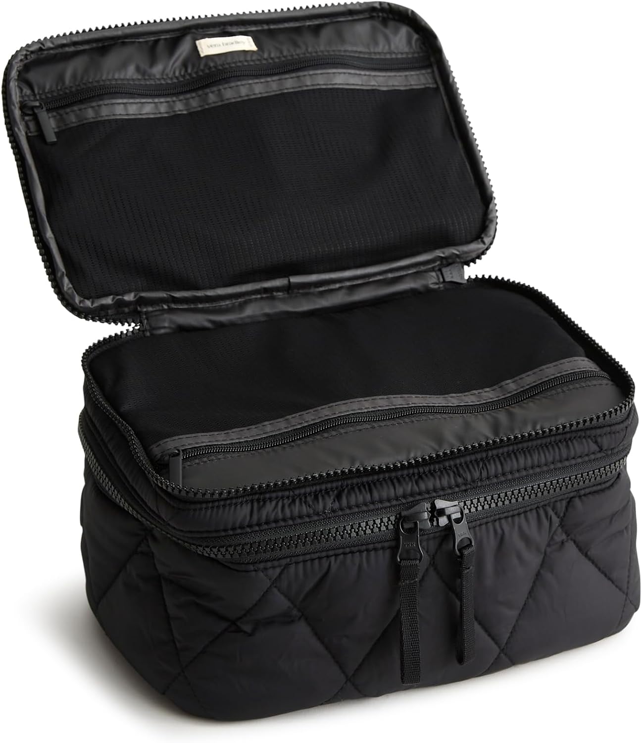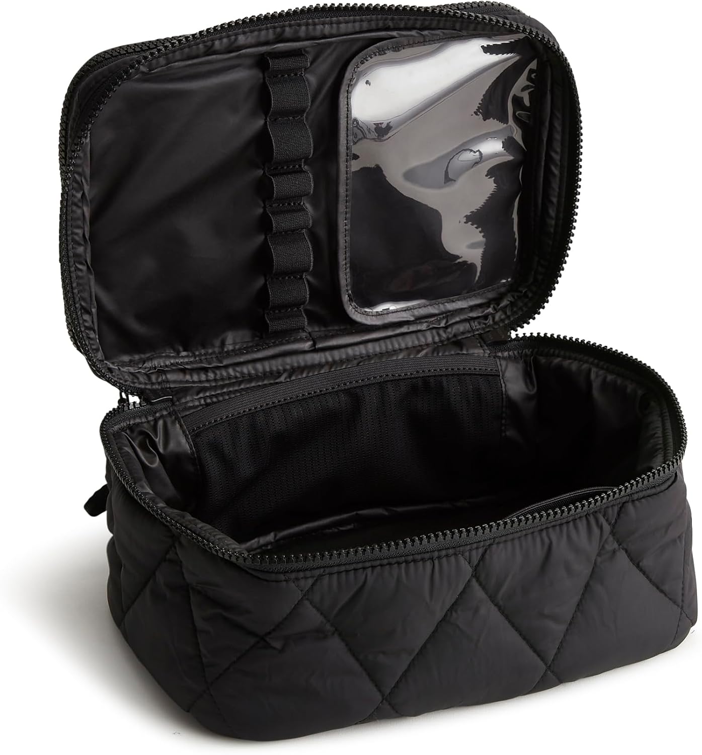 - DETAILS - Interior features two zip pockets, two slip pockets, and eight elastic makeup brush loops with a wipeable TPU cover