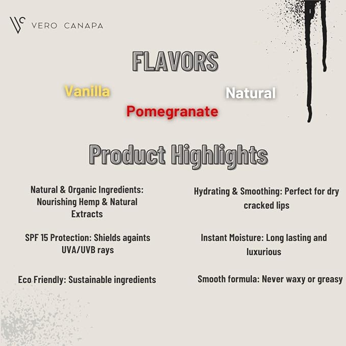 - VERO CANAPA LIP BALM now available in three naturally nourishing flavors: Natural, Vanilla and Pomegranate.