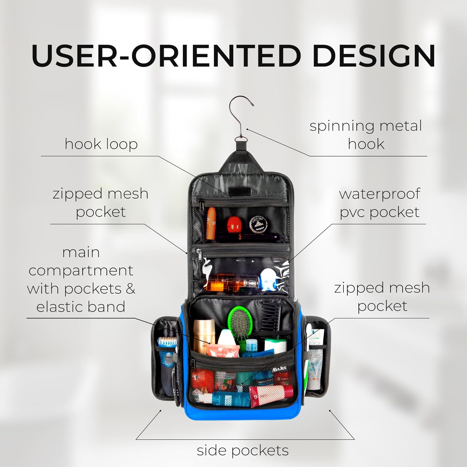 - INVEST IN THE TOP QUALITY YOU DESERVE: The reinforced double-stitched handle, extra durable zippers and the sturdy metal swivel hook make this hanging travel organizer uniquely long-lasting. 19 compartments with useful dividers and elastic loops will neatly store all your personal toiletry essentials, without taking up too much space in your luggage!