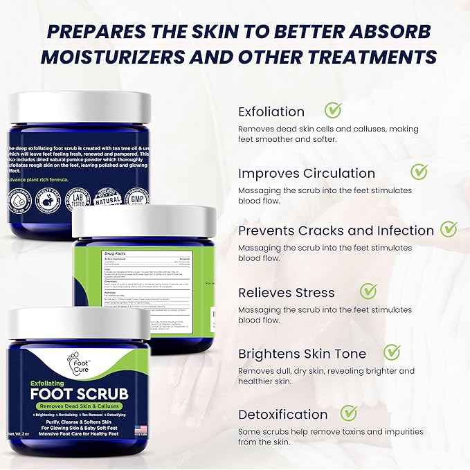 - Special Feature : CRACKED HEEL REPAIR: This luxurious, pampering foot scrub cleanses and exfoliates dry feet; the pumice stone acts as an exfoliant to slough off dead skin cells, this product is great for those who suffer from cracked heels or rough calluses on their feet, EXFOLIATING FOOT SCRUBBER & PUMICE STONE POWDER: Foot Cure's Eucalyptus Foaming Foot Scrub with Pumice Stone is perfect as a shower foot scrubber, to be used in a pedicure kit, or used between salon visits, FOOT SCRUB FOR SMOOTH, SOFT FEET: Exfoliating and foaming foot scrub with granulated pumice that exfoliates; made with a blend of essential oils containing eucalyptus, Tea Tree and lavender in a 2 oz jar, GENTLE & NATURAL INGREDIENTS: We pack our products with natural ingredients like coconut oil, shea butter, rose and other essential oils; all of our products are synthetic fragrance free, paraben free, and sulfate free; cruelty-free, LUXURIOUS SPA EXPERIENCE AT HOME - Transform your skin care routine into a luxurious spa session with our exfoliating hand scrub and foot scrub. This product targets the unique needs of men's skin, making it an essential part of body care for men. It’s perfect for those seeking pretty feet and hands rough skin remover original to revitalize and soften their skin. CRACKED HEEL REPAIR: This luxurious, pampering foot scrub cleanses and exfoliates dry feet; the pumice stone acts as an exfoliant to slough off dead skin cells, this product is great for those who suffer from cracked heels or r… See more