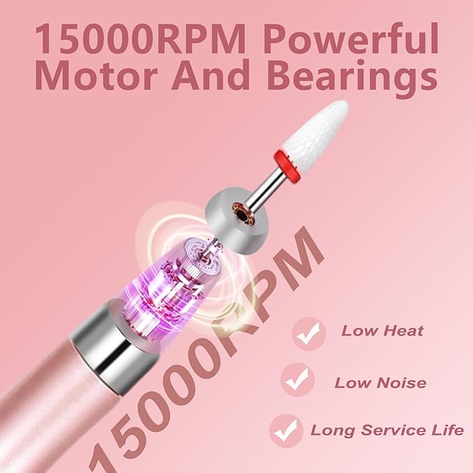 Electric Nail Drill File Cordless,Portable Rechargeable Nail File Kit for Acrylic & Gel Nails,Professional Efile for Manicure Pedicure Polishing,with 12 Nail Drill Bits 31 Sanding Bands,Rose Gold