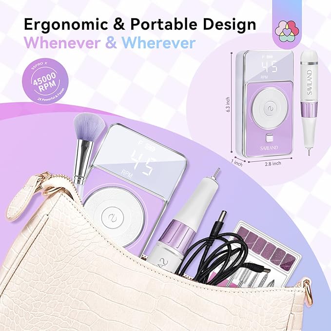 - Powerful 45000 RPM Motor: Achieve salon-quality results effortlessly! The SAVILAND Professional Nail Drill's powerful 45000 RPM motor removes acrylic nails in just 3 minutes, delivering smooth, precise finishes for acrylic, gel, and natural nails with low heat & noise & vibration