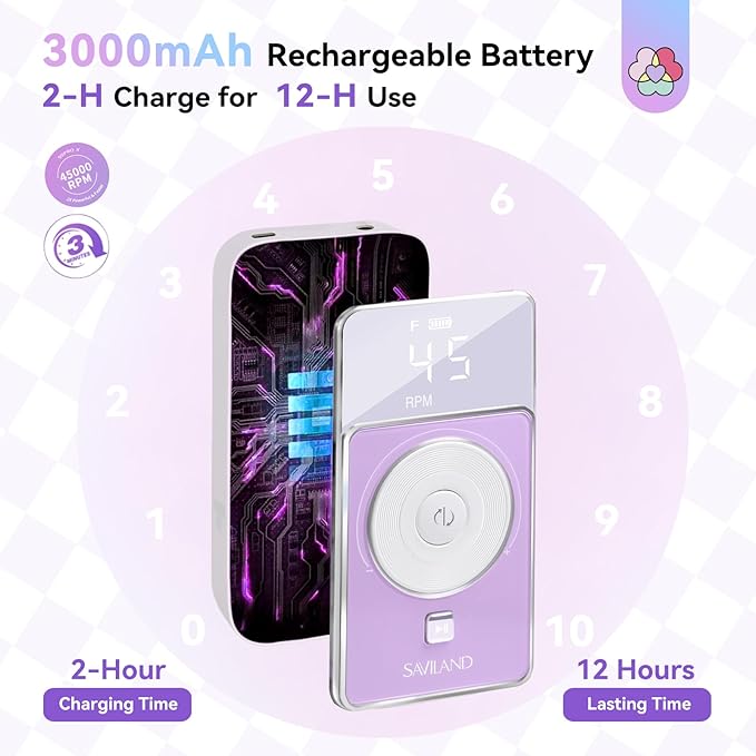 - Long-lasting Rechargeable Battery: Enjoy up to 12 hours use with a 3000 mAh rechargeable battery! After just 2 hours of charging, you're ready for long manicure or pedicure sessions without worrying about finding an outlet