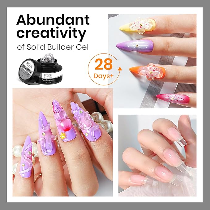 - Solid Builder Gel for Nails: MIZHSE new upgraded solid builder gel contains 1*30 g/1 oz hard gel for nails, 1*15 g 3D painting gel, 1*chrome nail powder, 1*double-head pen for 3D nails, and 36 pcs nail forms. This nail builder gel is solid material, and won't leak everywhere, just use your finger to extend your nails. Friendly for nail beginners and nail lovers