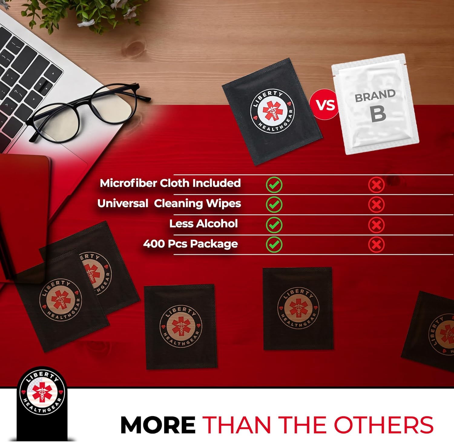 400 Eyeglass Cleaning Wipes + Microfiber Cloth for Eyeglasses & Lens Cleaner | Pre-Moistened, Individually Wrapped, Less Alcohol Formula | Lens Wipes for Eyeglasses, Eye Glasses, Lenses & Screen