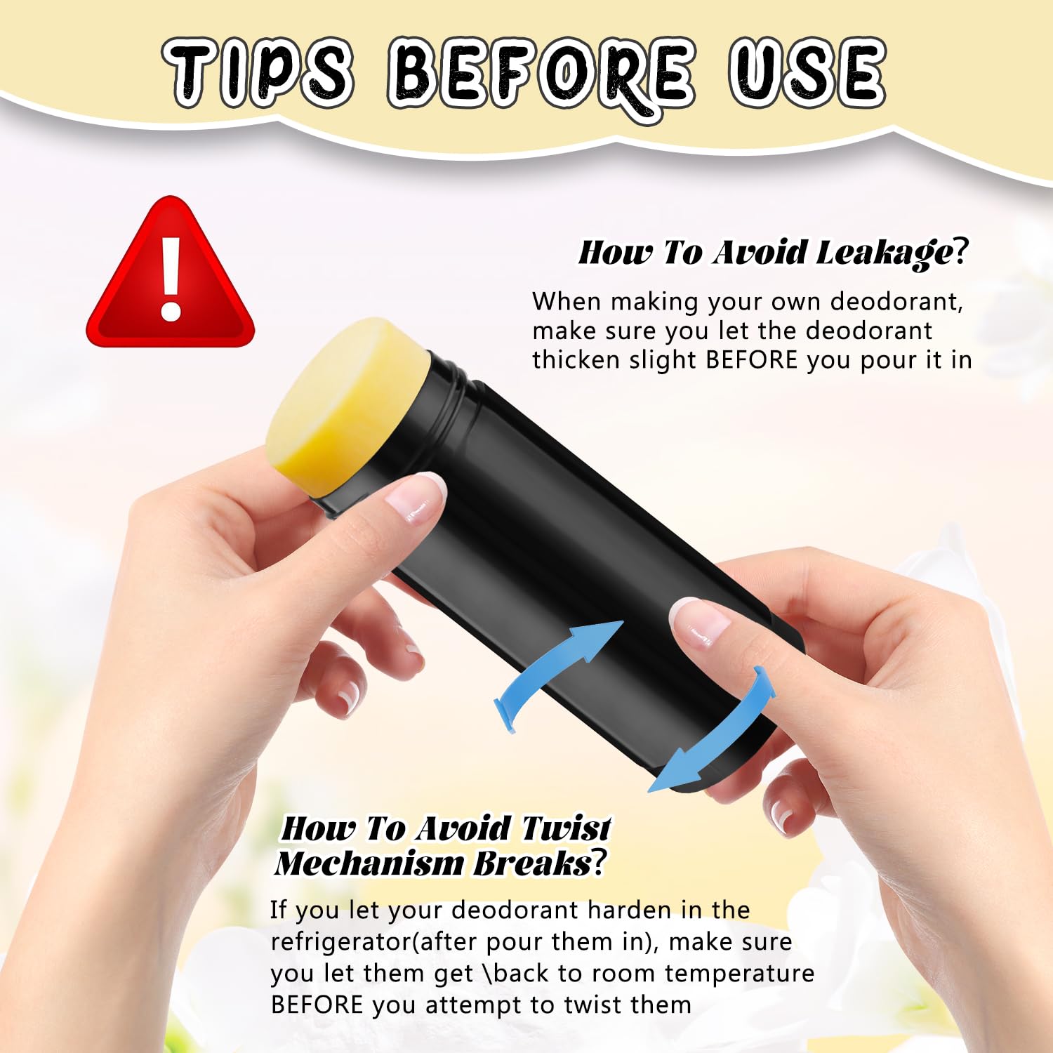 - 【Easy To Use】Pour your deodorant mix into the tube, let it cool/solidify;then turned the twist dial,the balm will slowly raise upwards to the desired level.applied to the necessary areas of the body, smoothly and easily.