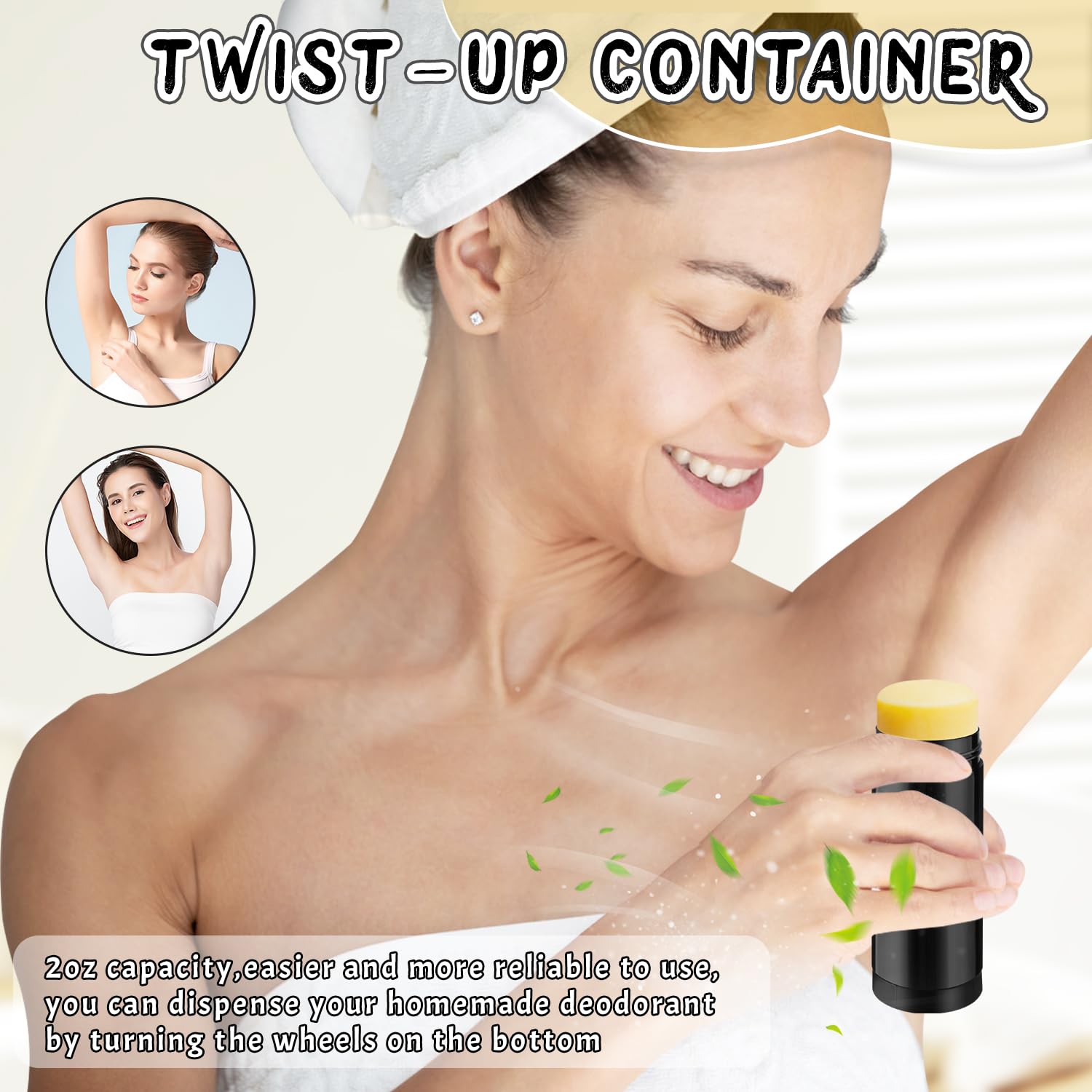 - 【Empty Deodorant Container】Package contains 15 PCS round containers with lids,2 oz/60ml,Each deodorant container has a turning mechanism,knob to turn deo up or down.plastic manual twist deodorant tubes;