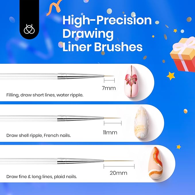 - 8 Pcs Nail Brush Kit: Our nail art brush set includes 8 double-headed brushes, with Bow knot stickers & Rhinestones. Whether it's for applying color /glitter gel, gradient blending, or dot / flower painting, shell swirl effects, and rhinestone application, it can handle it all with ease. It's perfect for nail art beginners and enthusiasts.