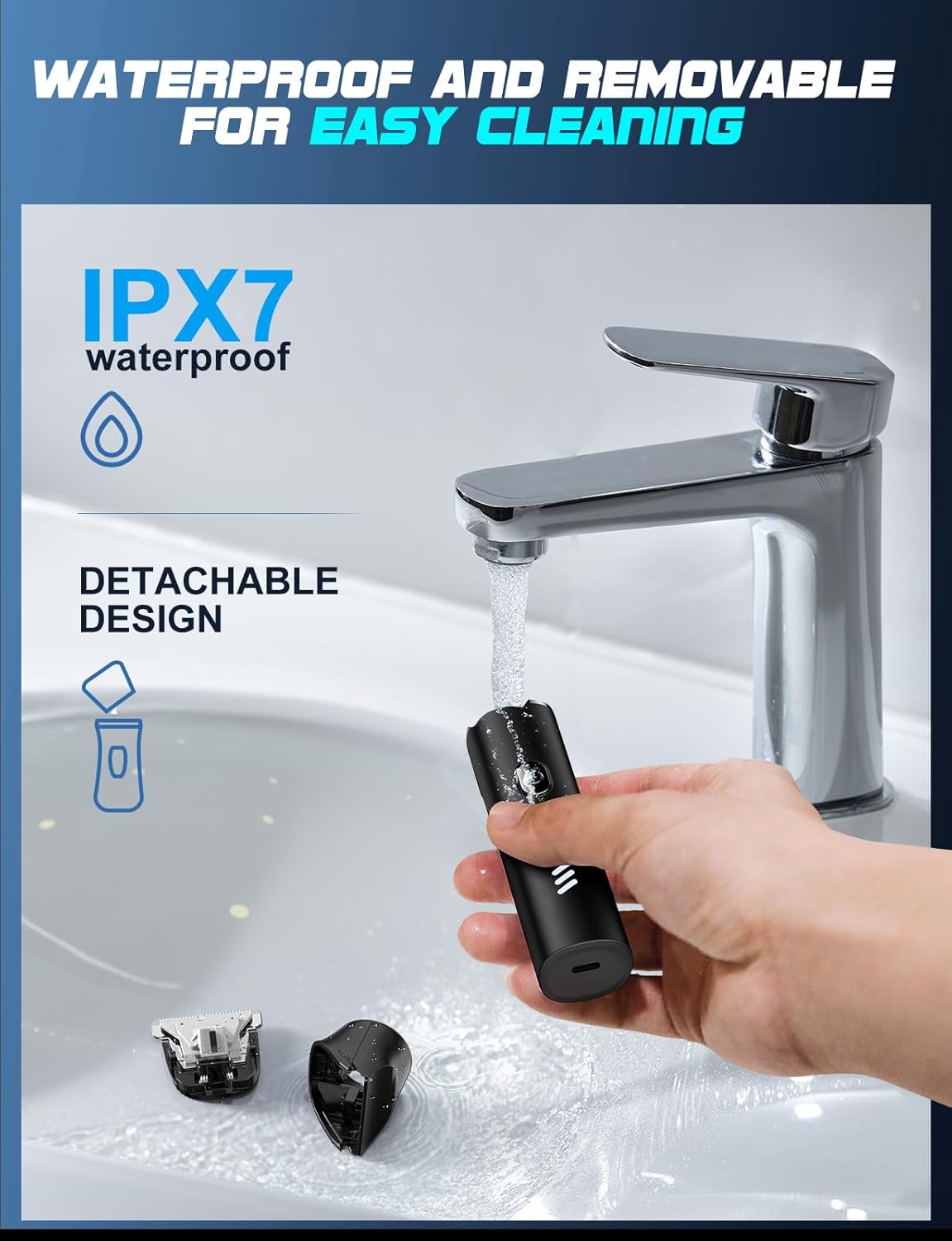 - IPX7 Waterproof & Easy Clean: The blade head of our trimmer for men is detachable and comes with a cleaning brush. Simply remove the head and rinse it under running water to effortlessly clean away hair residues. Enjoy a comfortable trim with our body hair trimmer before hanging out. Embrace your refreshing manscape!
