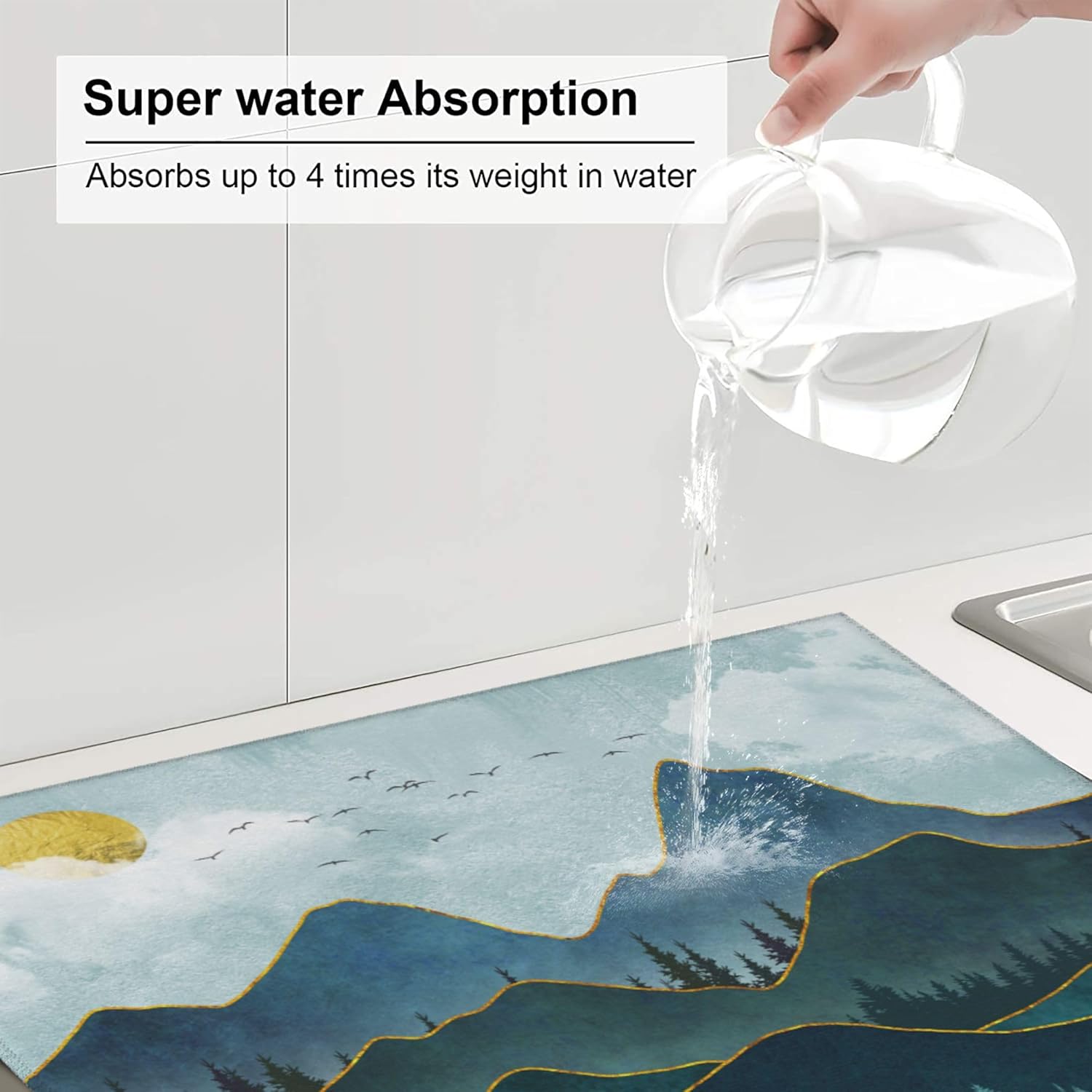 - Kitchen drying mat made of absorbing microfiber, and the middle is made of composite sponge, soft absorbent, non-slip, reversible, reusable