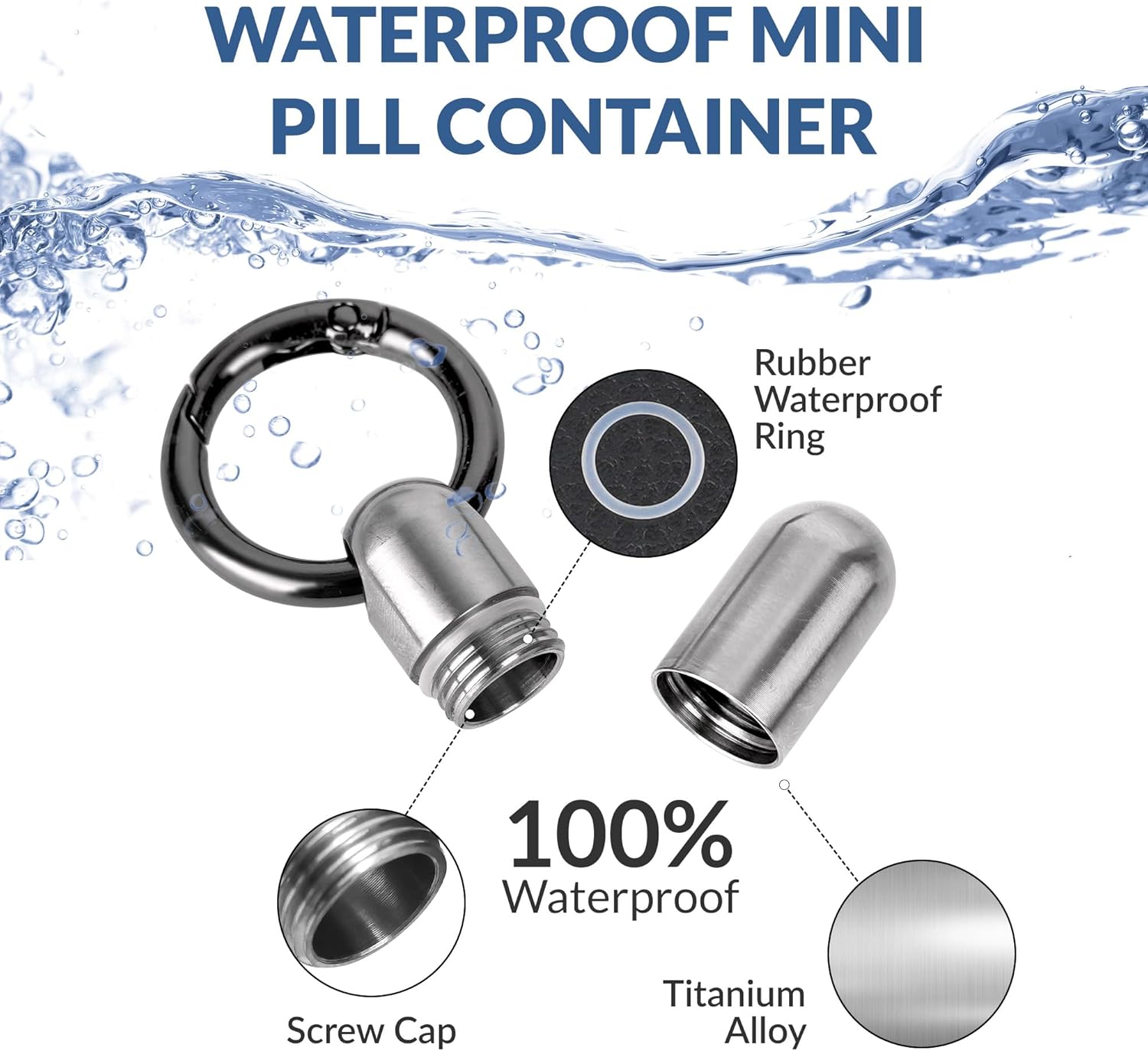 - INCLUDED ITEMS: 1× extended upgrade titanium pill holder keychain+1×save effort keyrings,2×rubber O-ring