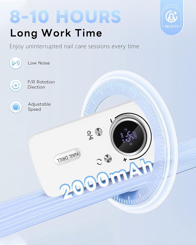 - 【8-10 Hours Long Work Time】Enjoy uninterrupted nail care sessions with our rechargeable nail drill, offering an impressive 8-10 hours of continuous operation on a single charge. Ideal for busy salon environments or long at-home nail treatments, ensuring consistent, reliable performance every time.