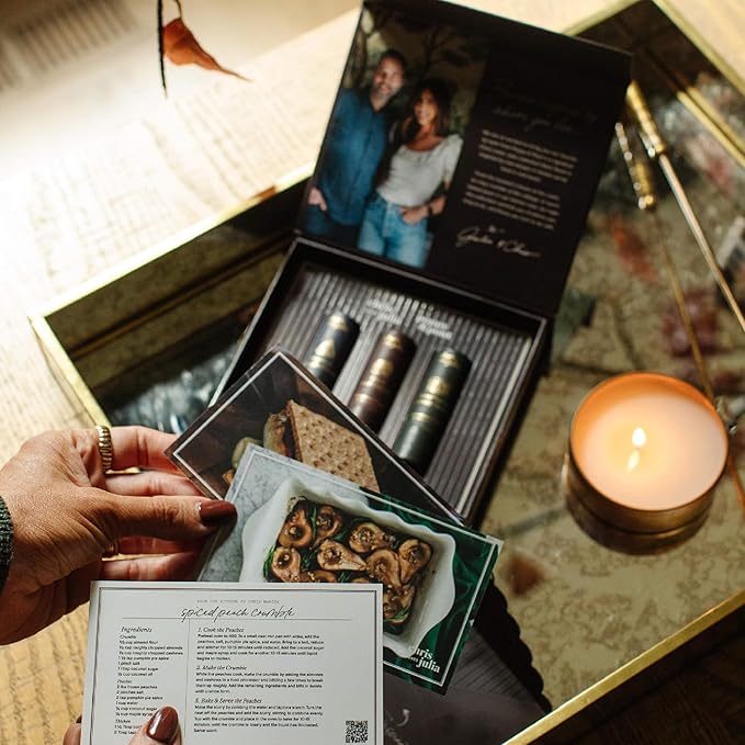 - CHRIS LOVES JULIA (limited edition) gift set featuring 3 lip balms: Blackberry Campfire S'mores, Spiced Peach Crumble, and Baked Pears & Rosemary Caramel.