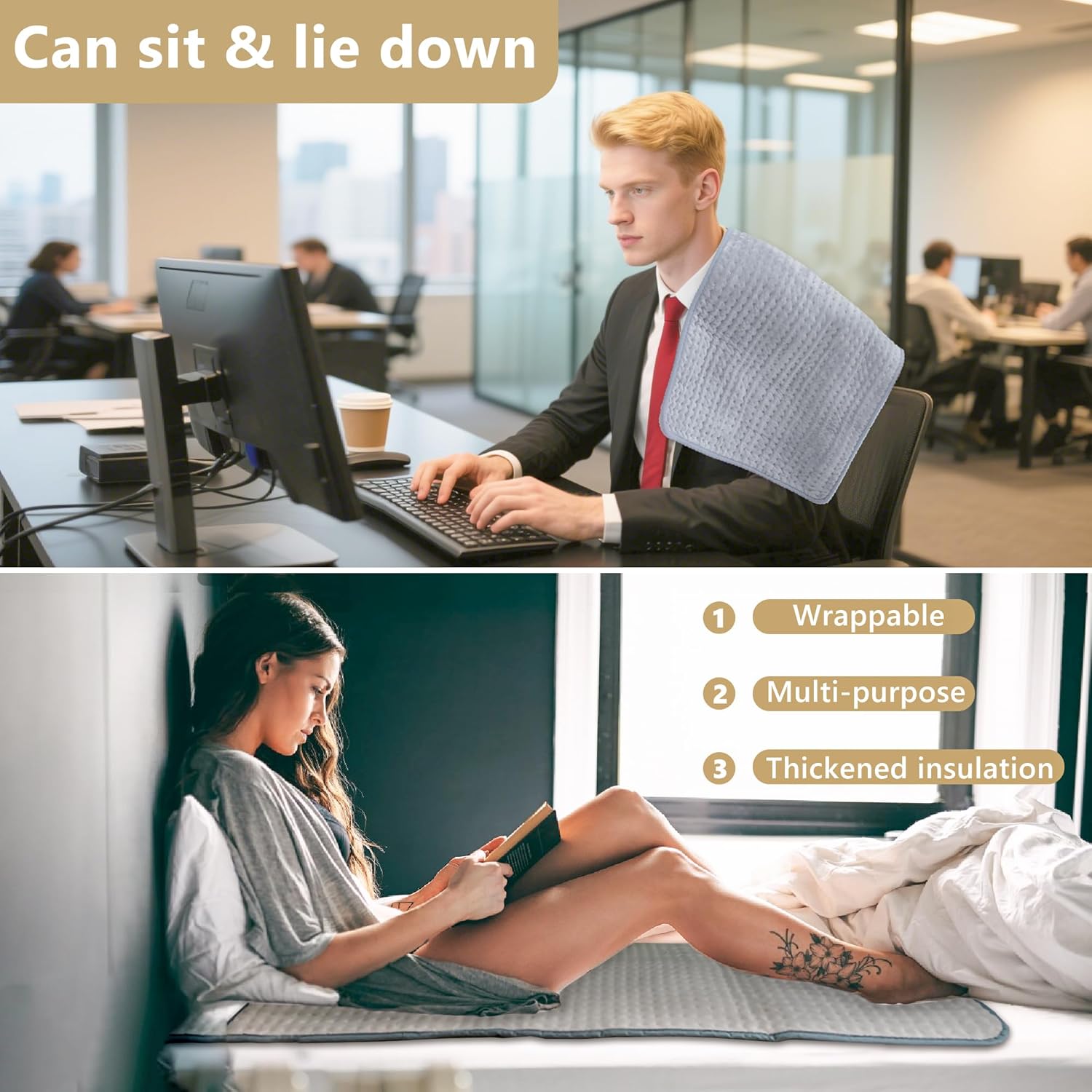 - 【Heating Pad for Sitting & Lying】This unique heating pad bends from 0-180°—use it upright for office work or lay it flat while sleeping. Made with soft machine-wash fabric, it’s ultra-portable, double-sided fleece, and perfect for travel