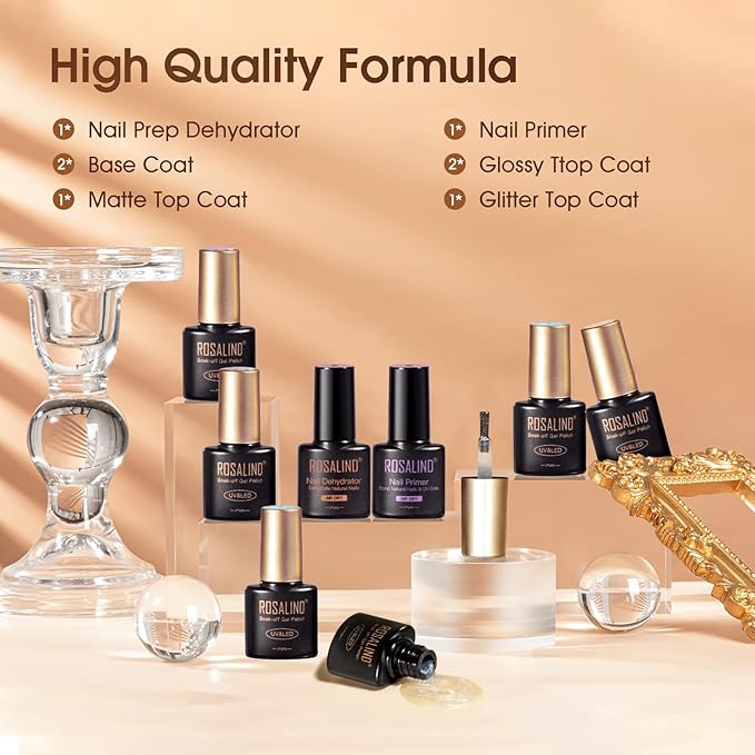 - WHAT YOU GET: 1pcs Nail Dehydrator, 1pcs Nail Primer, 2pcs Gel Base Coat, 2pcs Glossy Gel Top Coat, 1pcs Matte Top Coat and 1pcs Glitter Top Coat(5ml/0.17fl.oz, Mini Bottle) in a beautiful gift box