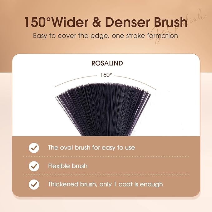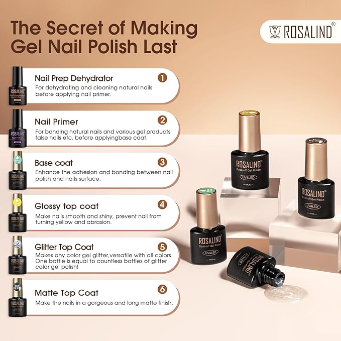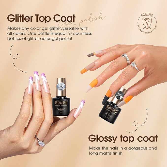 - MULTIPLE BASE TOP COAT: ROSALIND gel liquid set offers 3 top coats: Glossy/Matte/Glitter for a glossy, frosted, or shimmery effect respectively. In addition, it enhances the adhesion between the nail and the color gel while providing optimal nail protection.