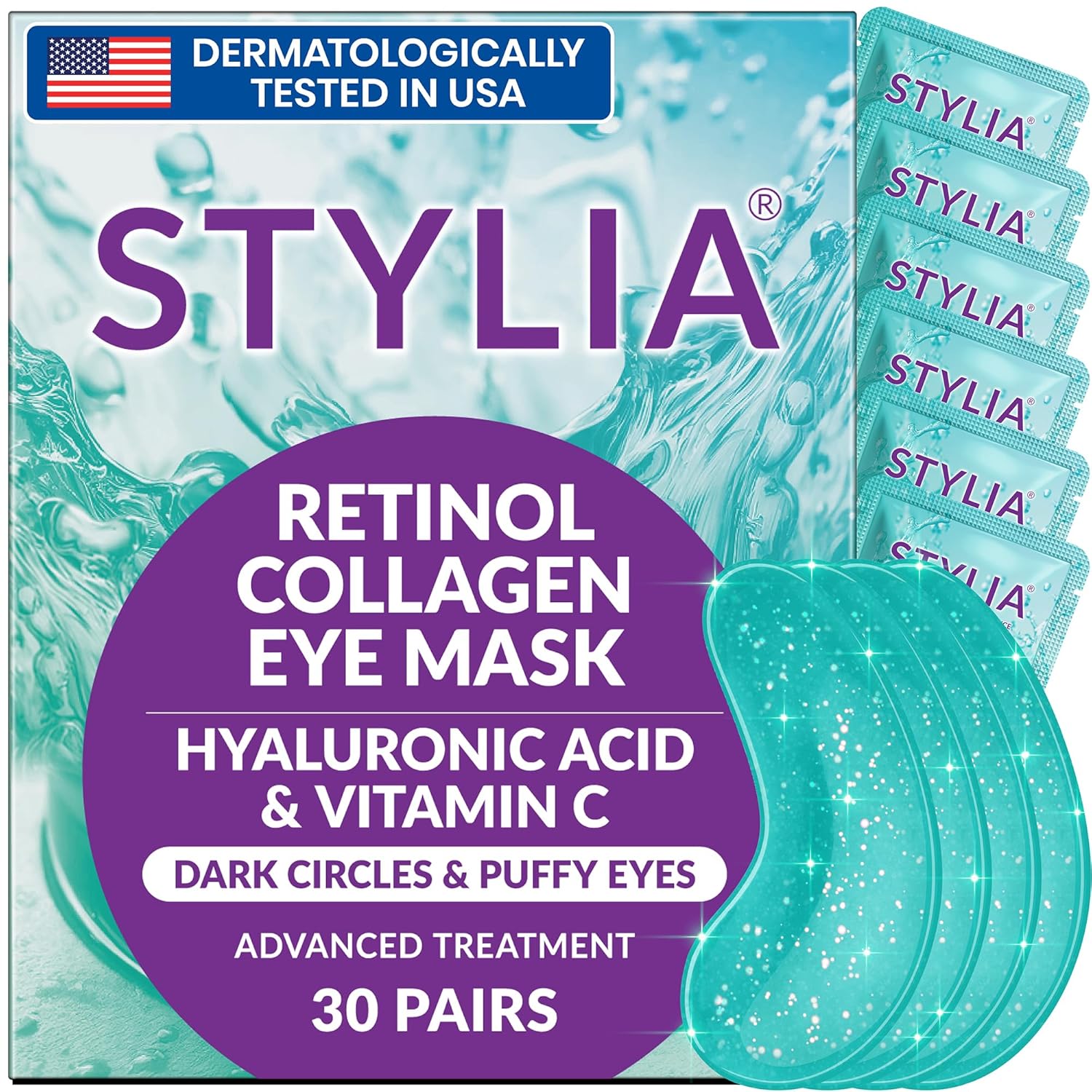 Stylia Under Eye Patches for Puffy Eyes and Dark Circles (30 Pairs) - Marine Collagen Under Eye Mask with Retinol, Vitamin C, Hyaluronic Acid, Pearl Extract - Eye Masks for Dark Circles and Puffiness