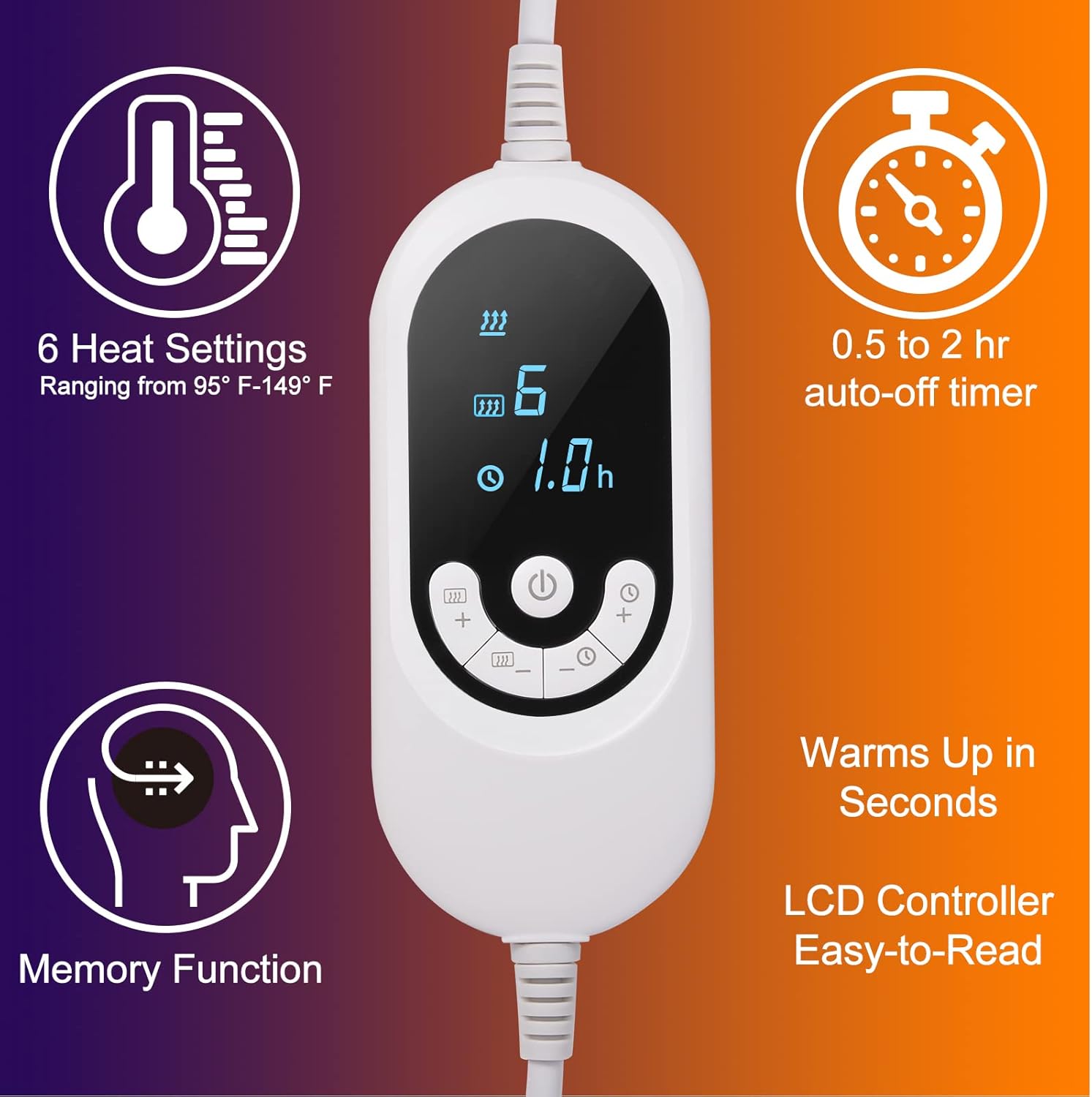 - 【Manage Heat As You Need】:The weighted heating pad offers 6 heat settings (40/45/50/60/65/70℃丨104℉-158℉), allowing you to customize the desired temperature. Features 6 timers, with auto-off settings ranging from 0.5H to 4H to meet your different needs(30min, 60min,90min, 120min, 3H, 4H). This helps conserve energy and prevents excessive heating, offering more options for you.