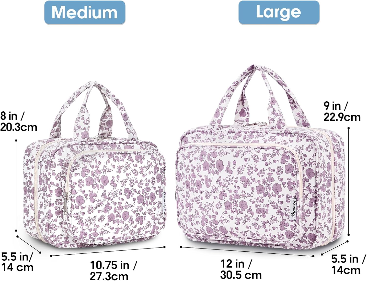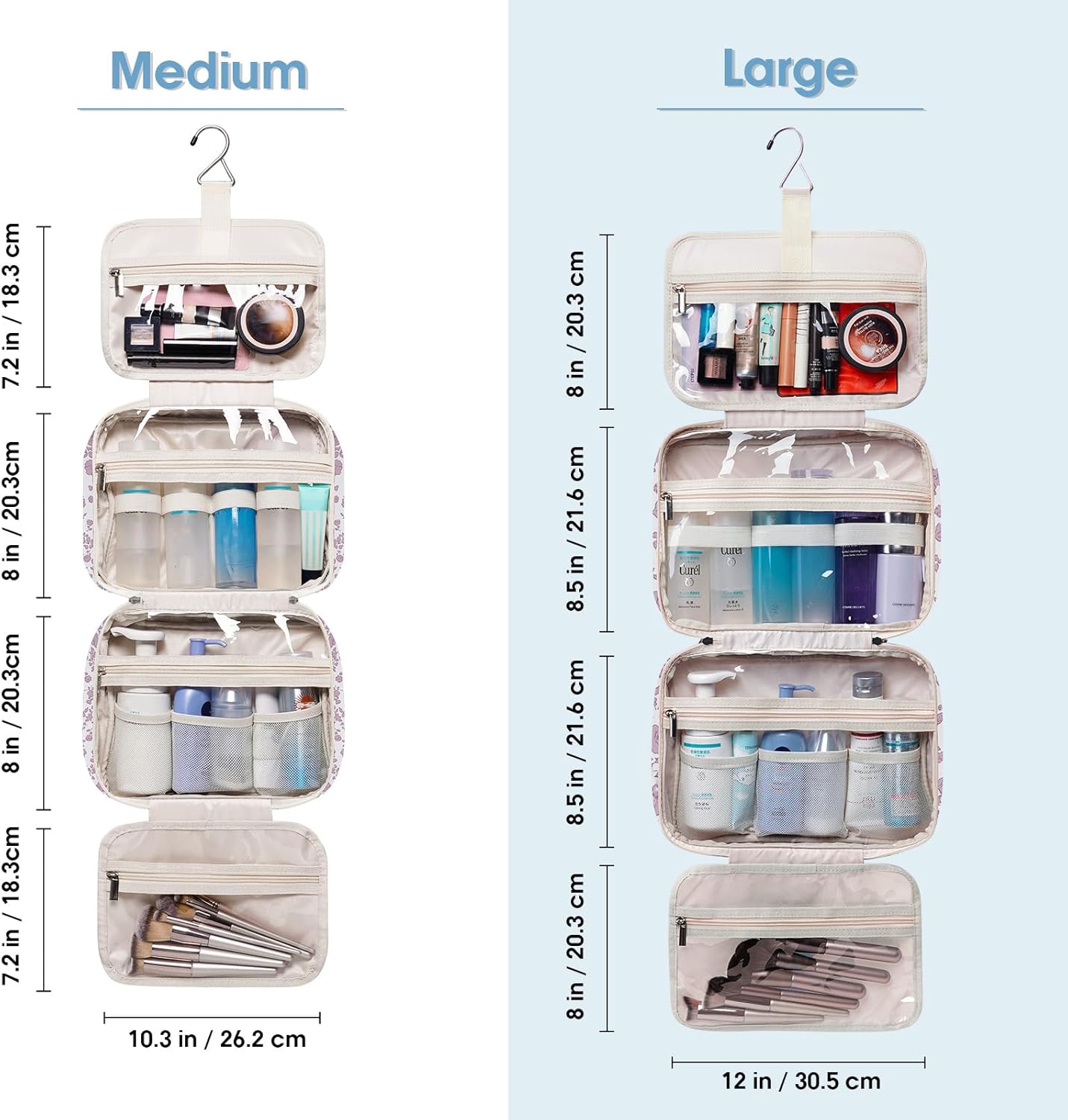 - LARGE VERSION - Fold size 12"x9"x5.5”/30.5x22x13 cm. We launch larger version to meet large-capacity, which you may choose large or medium size based on your needs. It could easily fit full-size travel essentials like shampoo & conditioner, lotion, face wash, toothpaste, toothbrushes, hair brush and daily makeups