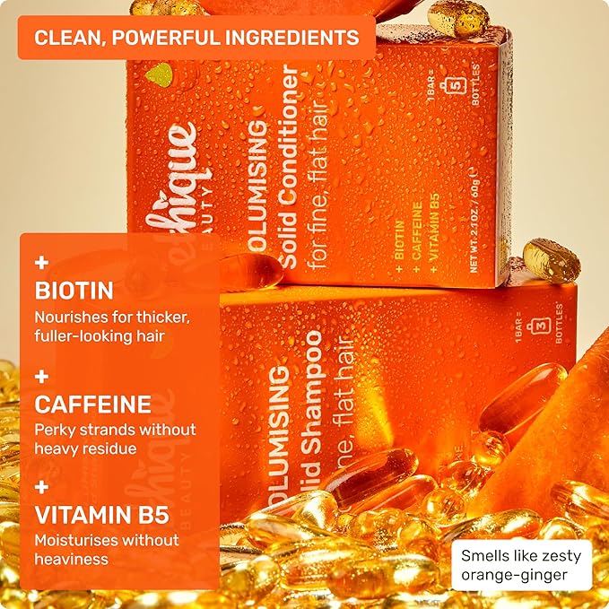 - ROOT REVIVAL: Say goodbye to flat, lifeless hair! Our Volumizing Conditioner Bar promotes body and lift for fuller, thicker-looking hair with every wash. Bring volume back to your hairstyle with natural ingredients like nourishing biotin, caffeine stimulating roots, and Vitamin B5 moisturizing without heaviness.