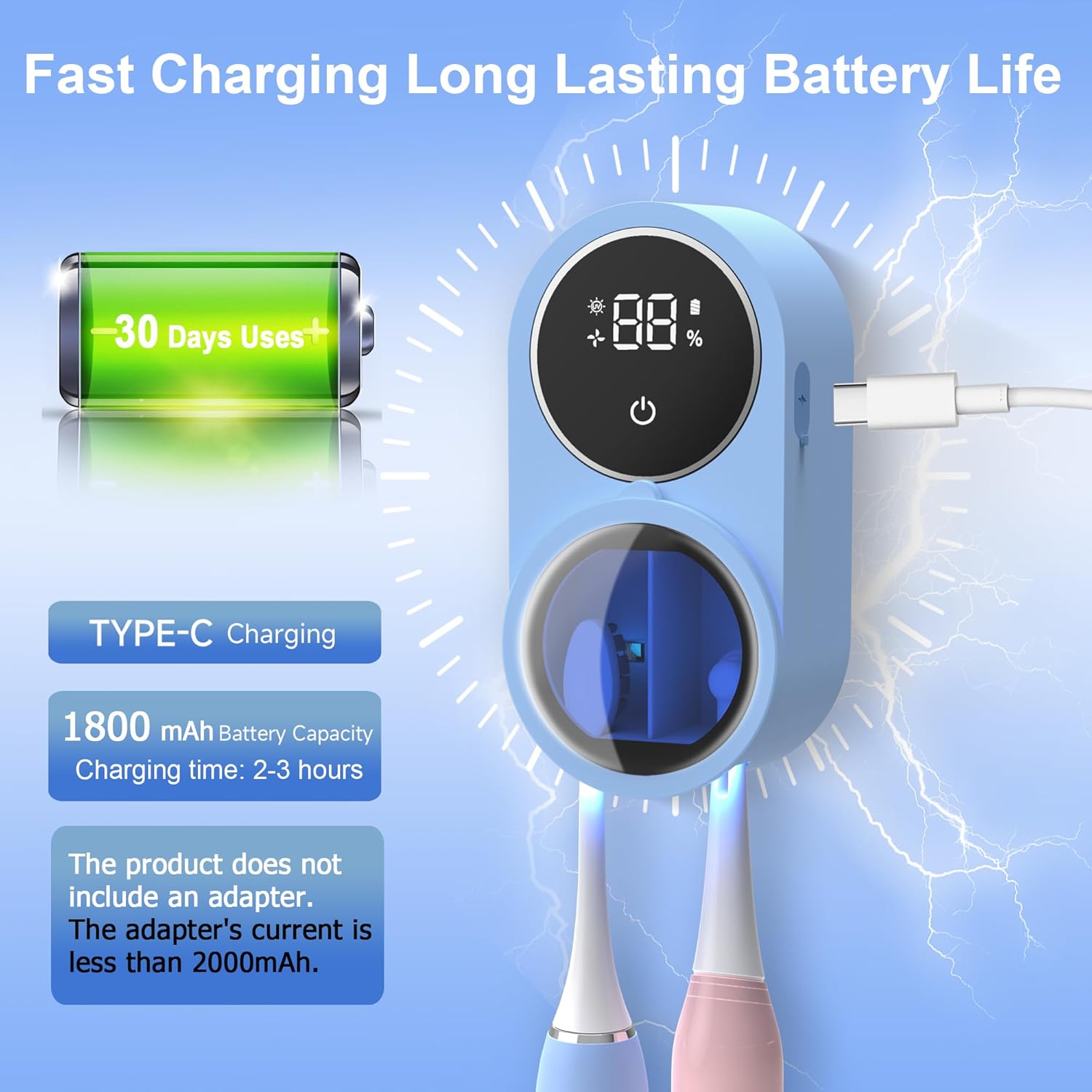 - Convenient Design - The battery capacity of this product is 1800mAh, and it is charged via USB-C port. The toothbrush holder usually lasts about 30 days on a single charge and can be used as a portable device when travelling and on holiday. It can also be installed as a wall-mounted unit in the washroom