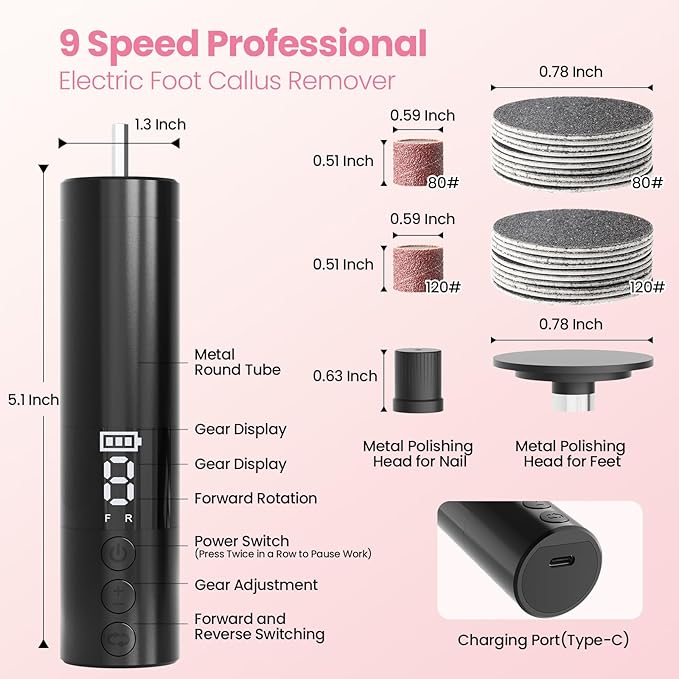 - 【9 ADJUSTABLE SPEED POWERFUL ELECTRIC FOOT FILE】: This electric callus remover is compact, stylish, well-made and powerful. Updated speed (550-1000 rpm) can be easily adjusted by the speed button, which make removing dead hard skin from feet is more convenient. NOTE: This electric foot file is only used for common dead skin, not suitable for severe thick calluses