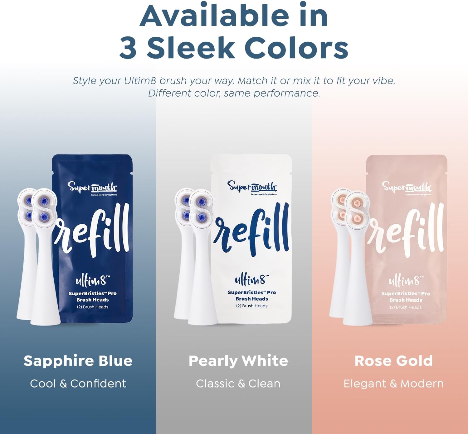 SuperMouth® SuperBristles® Pro Replacement Brush Heads for Ultim8 SmartBrush – Ultra-Soft Bristles Remove 40X More Plaque, 3X Denser, Advanced Sonic Cleaning, Dual Modes, 3 Color Options