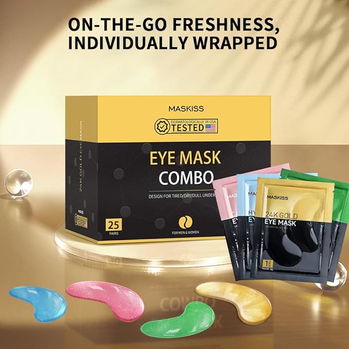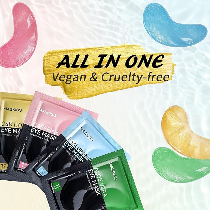 - Comprehensive Eye Care Treatment: The Maskiss set includes 4 colors, 25 pairs of under-eye patches. 24k Gold eye mask helps to smooth the skin, reduce fine lines and wrinkles. Caffeine eye patches help promotes eye metabolism and circulation, and reduces eye bags and puffy eyes. Hyaluronic acid eye masks help to fade dry lines and wrinkles, and locks in moisture and nutrition. Aloe vera eye patch helps to reduce pigmentation, repair the healing barrier, and gently moisturize the skin. Add these to your daily self-care routine for a visibly younger, well-rested appearance.