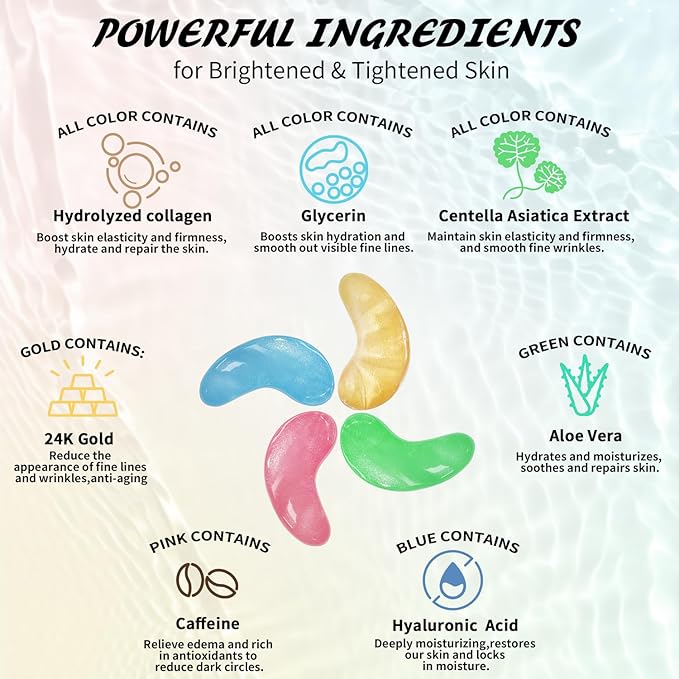 - Safe & Effective Ingredients: Our under-eye patches are infused with a powerful blend of collagen, hyaluronic acid, caffeine, and natural plant extracts which work together to deeply repair, soothe, rejuvenate, and protect the delicate skin around your eyes — without any irritation. The ingredients of our under eye patches for dark circles and puffy eyes are vegan, sulfate-free, and gentle on all skin types.