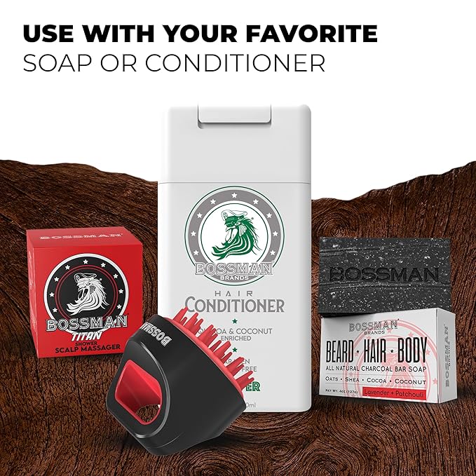 - Applies Products Evenly: Transform hair care routine with Bossman precision-engineered shampoo scalp massager which will enhance hair care products' performance and effectiveness. Designed to complement Bossman Shampoo and 4-in-1 Bar Soap, this scalp scrubber for shower optimizes hydration and nutrient absorption. Let this manual scalp massager lead the charge in your grooming arsenal.