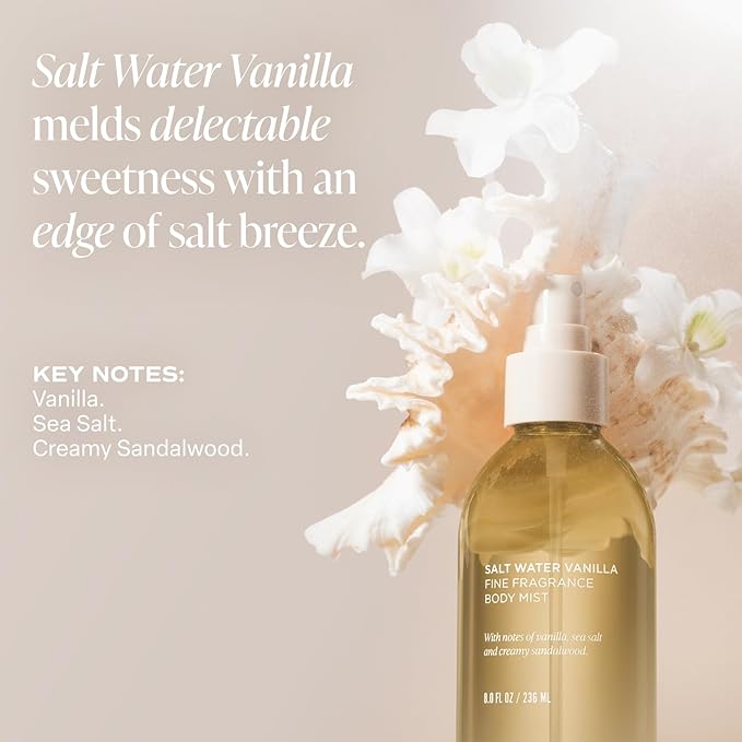 - SALT WATER VANILLA FRAGRANCE: Vanilla, Creamy Sandalwood, and Sea Salt create a luxuriously smooth yet refreshingly airy blend, evoking the sensation of warm coastal breezes and velvety woods. Salt Water Vanilla is warm and enveloping, yet comforting and sweet.