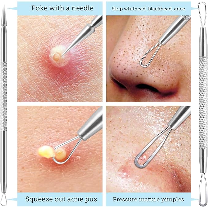 - 2 pcs pimple popper tools: Blackhead remover tools are in different sizes and angles for extract blackheads, whiteheads and remove different sizes of pimples, zits, acnes, fat grains on your chin, cheek, forehead and nose