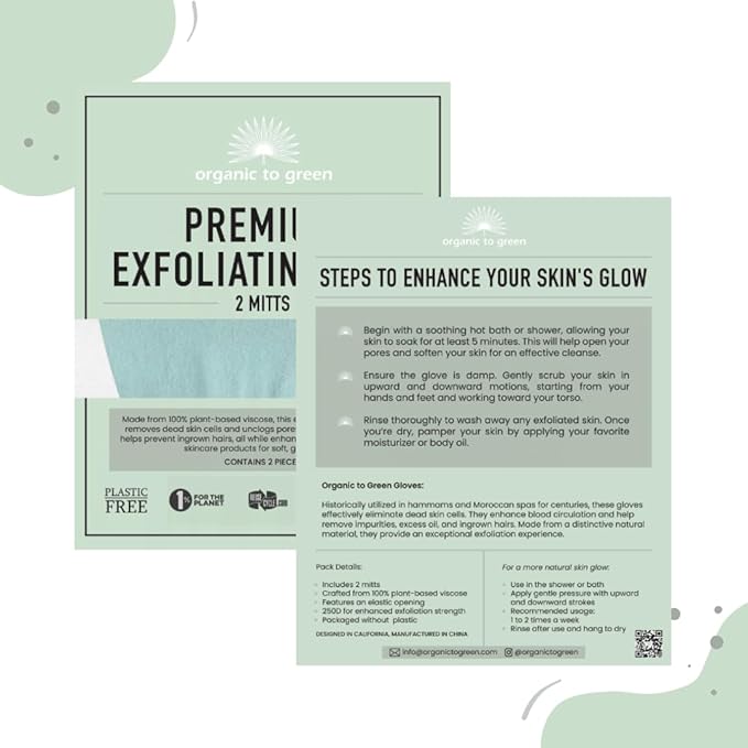 - Better than Loofahs or Chemical Exfoliants – Loofahs and chemical exfoliants don’t have the skin-gripping power of our Premium Exfoliating Mitts, meaning they’re not as effective at removing dead skin. Our body mitts are certified vegan, offering a naturally effective alternative – they’re rough enough to deeply exfoliate while soft enough to buff and smooth. Plus, our product packaging includes step-by-step instructions for customized results!