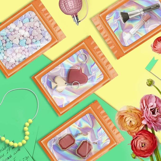 ANZNKU 100 Pcs Smell Proof Mylar Resealable Bags, Holographic Packaging Bags, Resealable Odor Foil Pouch Zip Bag with Clear Window for Food Storage and Lipgloss, Jewelry Lash (Orange, 4.7 x 7.9 Inch)