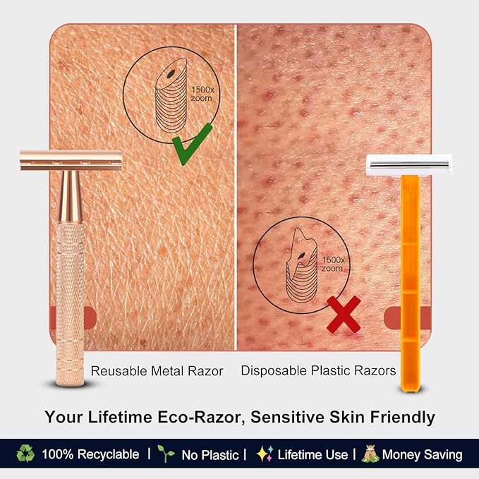 - Eco-Conscious & Built to Last: Shaving with our reusable metal safety razor - a zero-waste essential for eco-friendly shaving. Crafted from long-lasting, fully recyclable metal, this vintage-inspired double edge razor saves money and reduces environmental impact. With the right care and maintenance, it can last a life, aligning with sustainable lifestyles. (No parts to replace, just replace standard safety razor blades) Change the way you shave, choose our single blade razors for men and women