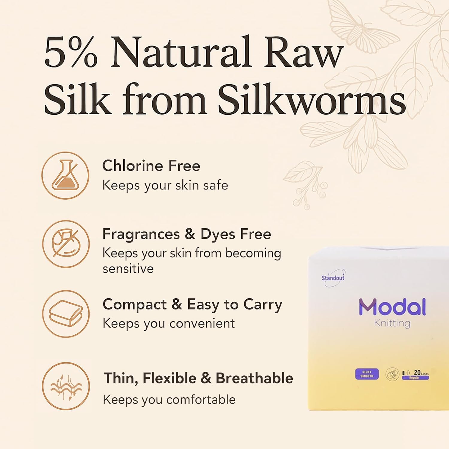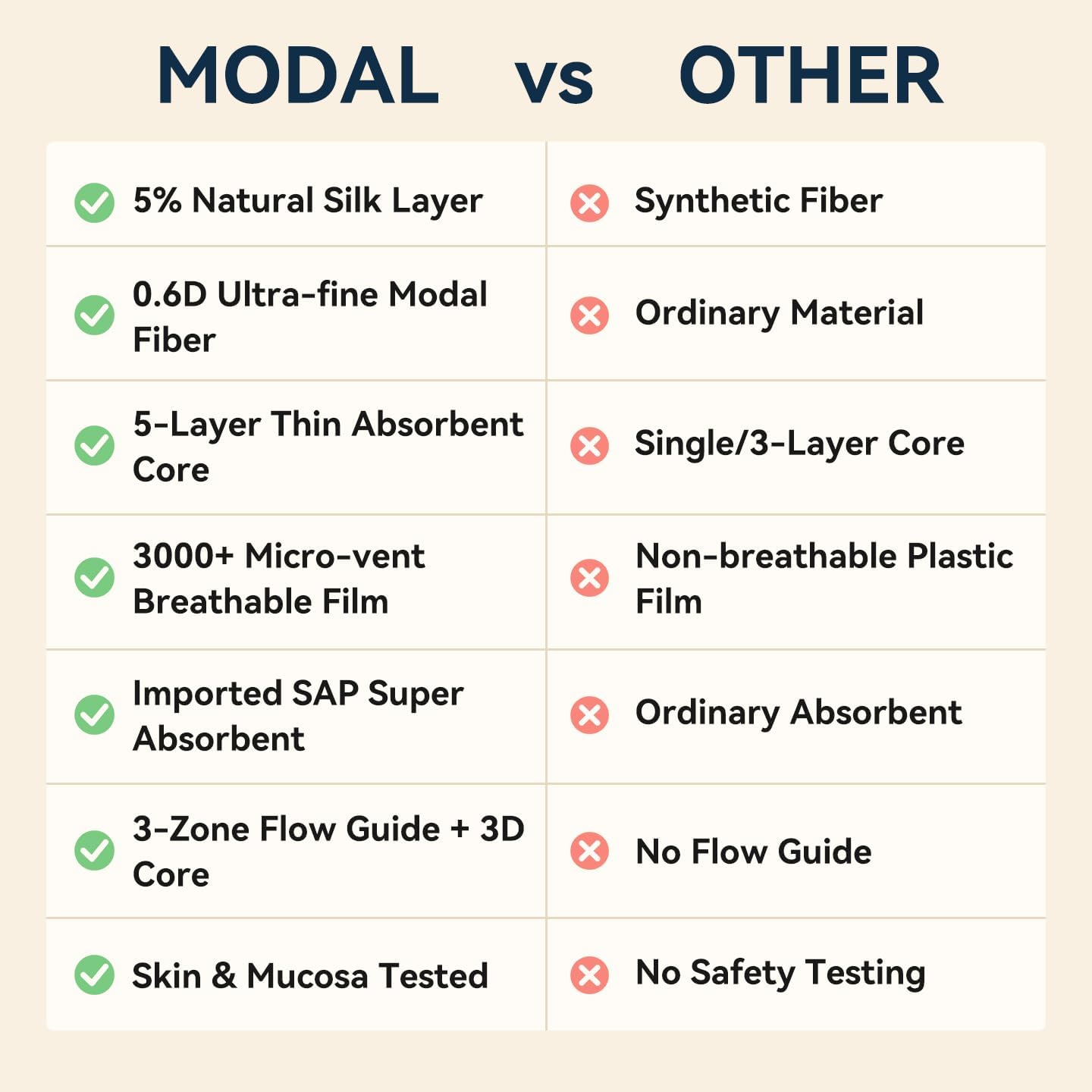 - Silky-Smooth Natural Material: MODAL sanitary pads are made of a mixture of natural silkworm silk and modal fabric, providing a fluffy, silky texture, like the comfort of wearing high-end underwear, bringing a relaxed and happy mood through a special period.