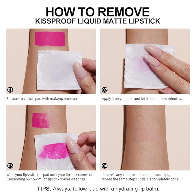 - NOTE!!!: Before Matte Lipstick need to moisturize your lips to prevent dryness or peeling of the lips. Avoid contact with oiliness on the lips, which can be wear for a long time. Peel off lip stain can be easily removed with makeup remover