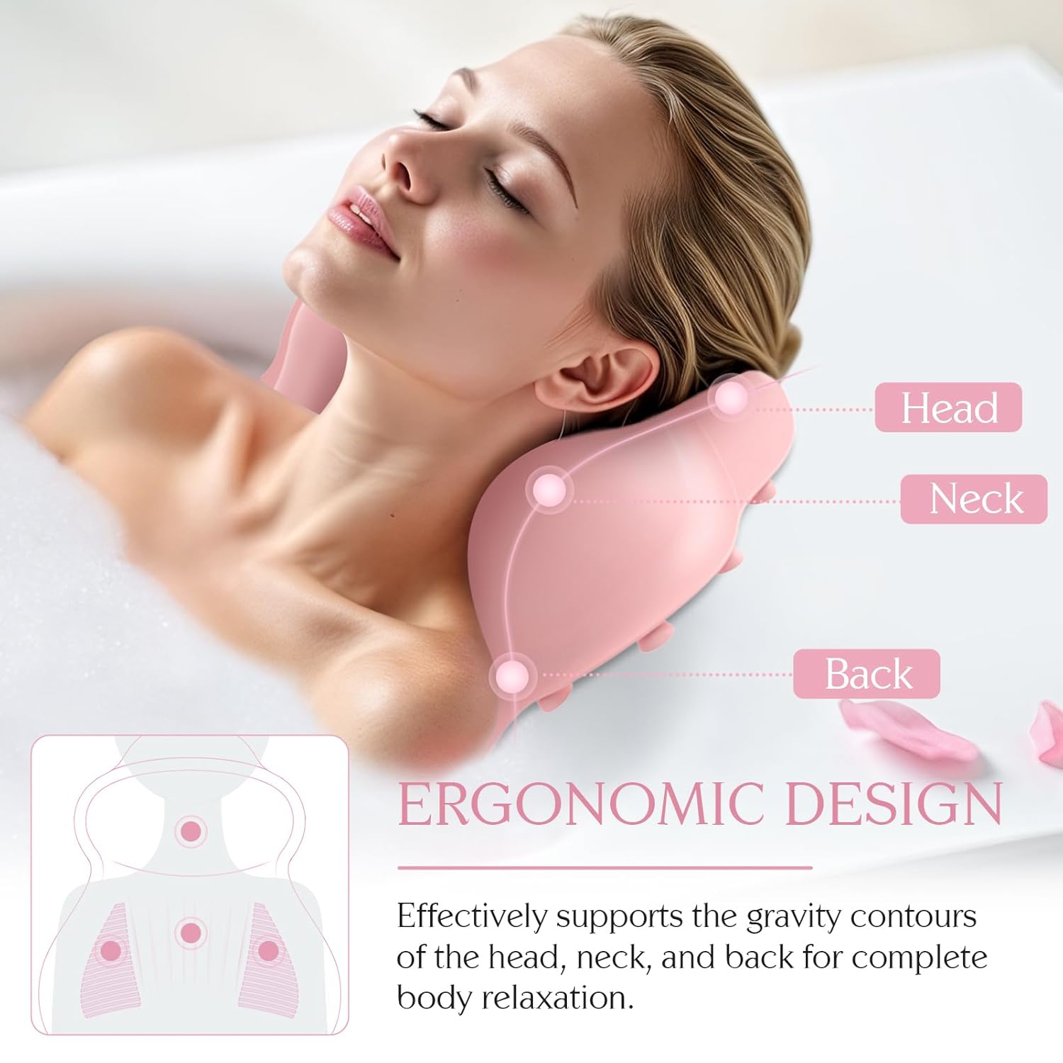 - 【Powerful Anti-Slip Suction Cups】The back of the bathtub pillow is designed with small deepened suction cups that securely attach to any smooth surface, ensuring stability and eliminating the need for frequent adjustments.