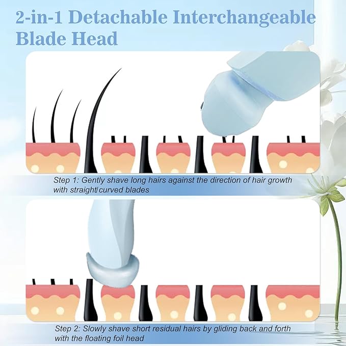- 💞【Hypoallergenic Skin-Friendly Blades】The new silk glide razor is made of hypoallergenic stainless steel blades and the curved head is designed to shave according to the contours of your body. The women's electric shaver trims facial and body hair quickly and precisely and gently without nicks or redness and without leaving any residue