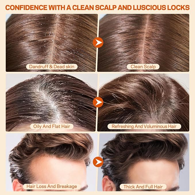 - DEEP CLEANSING, SAY GOODBYE TO GREASE: Are you struggling with an oily scalp that makes your hair look greasy and lifeless? Our scalp exfoliator scrub for dandruff is here to help. It effectively removes excess sebum, dirt, and product buildup, unclogging hair follicles. The gentle exfoliation process controls oil production, leaving your scalp clean and your hair fresh and voluminous.