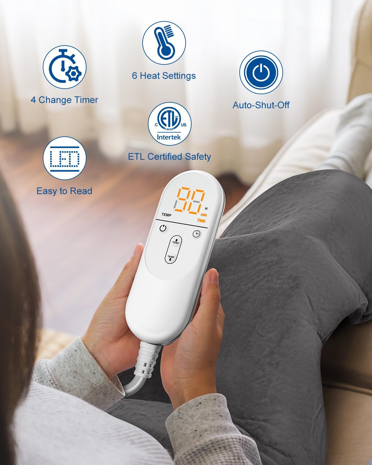 - Relax with Peace of Mind: Our heated pad isn't just comforting; it's a fortress of security. UL certified for safety and featuring automatic overheat protection. Personalize your experience with 6 adjustable heat settings (gentle to intense) and 4 auto-shutoff timers. Perfect for falling asleep worry-free or focusing on work. Whether it's Grandma using it while reading, your spouse snoozing on the couch, or you powering through emails at your desk, the combination of certified safety and personalized settings ensures maximum comfort with zero stress