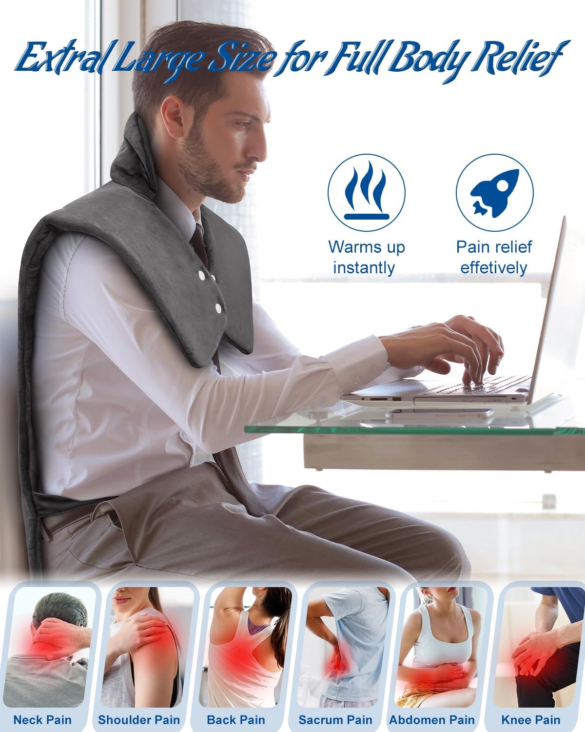 - Extral Large Size for Full-Body Relief: Our large heating pad (24"x37") effortlessly drapes from neck, shoulders, and upper back all the way down to lower back. Feel enveloped in soothing warmth, no matter your shape. Easily reposition it to soothe your abdomen (period cramps), knees, thighs, or calves. Ideal for anyone needing deep relief: parents after chores, office workers with stiff backs, grandparents with athletes, or anyone wanting full relaxation at home or work. Tackles pain from daily strain, stiffness, or soreness comprehensively