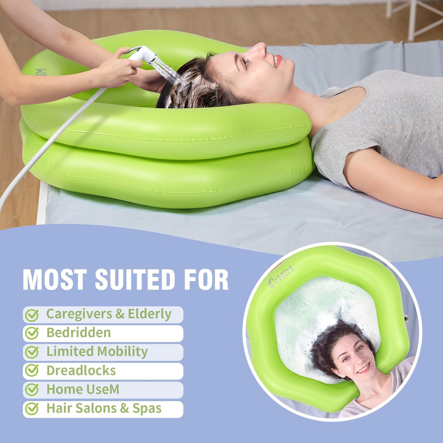 Inflatable Shampoo Basin for Bedridden, Elderly & Disabled - Petal-Shape Large Size, 360° Neck Support, Central Drain Hole with Pull Ring | Leak-Proof PVC Portable Hair Washing Bowl (Green)
