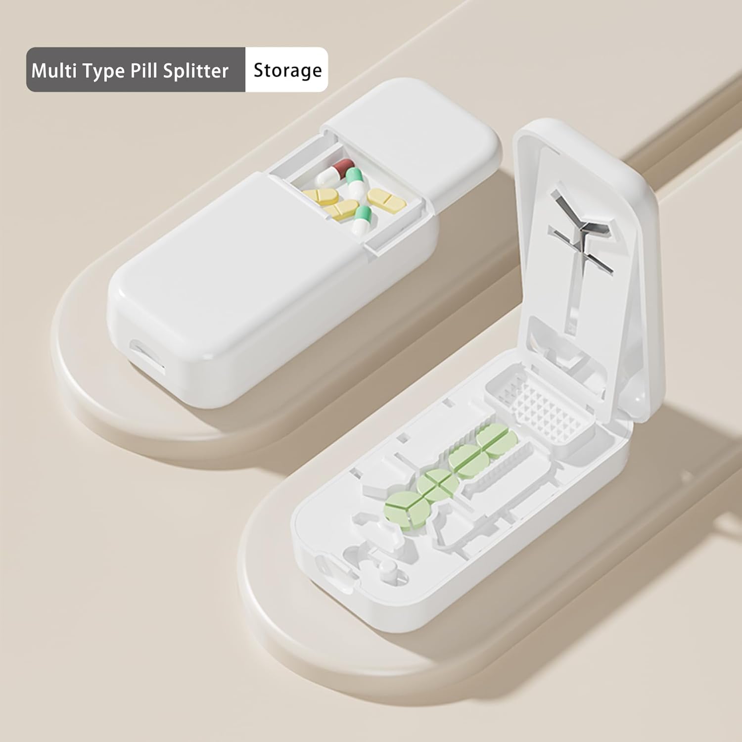 Precision Pill Cutter with Centering Guide - Multi-Angle Tablet Splitter for 1/2, 1/3 & 1/4 Cuts, Includes Pill Crusher & Storage Compartment (White)
