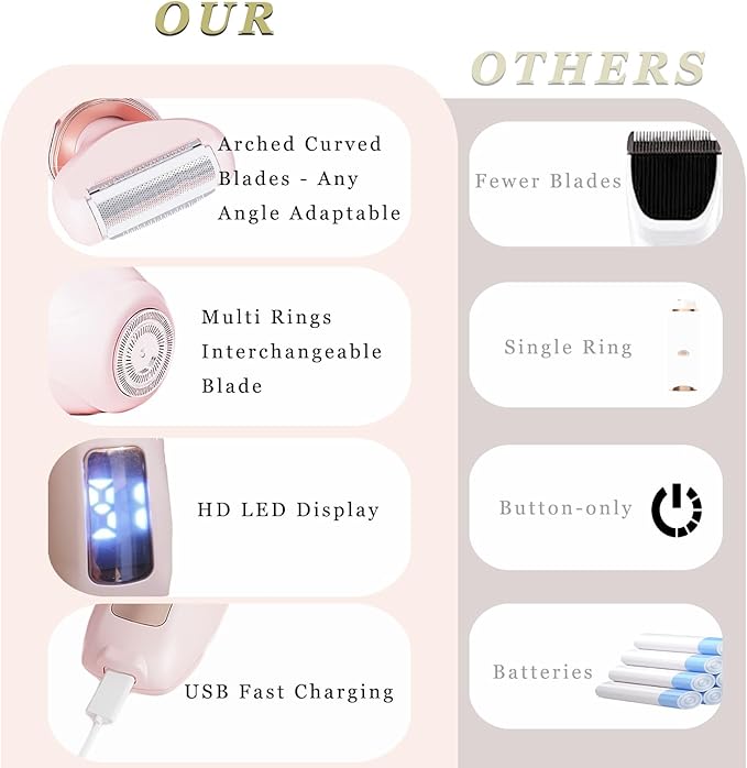 - Ultimate 3-in-1 Women's Trimmer System : This premium bikini trimmer for women features three professional cutting surfaces - arched blades for curves, circular mesh for sensitive zones, and floating blades for precision - adapting to all hair types and body contours. The built-in mirror and ergonomic design provide perfect visibility and reach for private areas, underarms, arms, thighs and facial grooming, while the LCD clearly displays battery status for worry-free use
