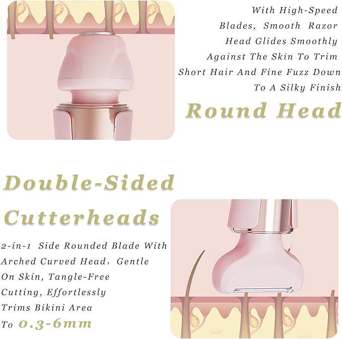 - Advanced Dual-Head Trimming Technology : Experience next-level grooming with this electric razor for pubic hair trimmer women, featuring a curved arch blade head that glides flush against skin without irritation, combined with precision rounded blades that cut cleanly without pulling. The specialized round finishing blades deliver smooth 0.3mm results, all powered by a high-performance motor that's 20% stronger for effortless full-body trimming