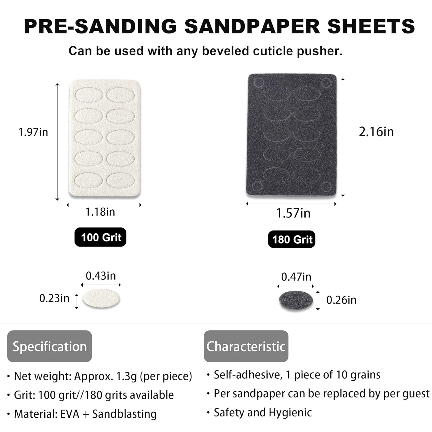 - Self-adhesive Mini Nail Files - The back of the nail file sandpaper is self-adhesive, very easy to use and replace, the mini sandpaper piece need to be used with cuticle pusher tool. These nail polishing sand papers are disposable, more healthy and hygienic.