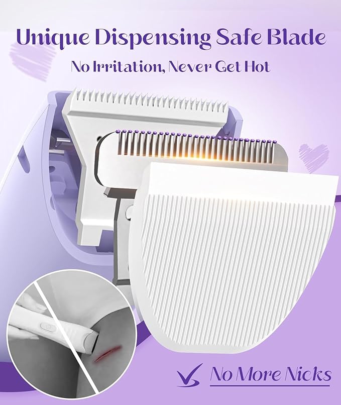 - 💜 Painless & Hypoallergenic for Sensitive Skin: Featuring sharp ceramic blades and a safety resin coating, this trimmer glides smoothly to remove hair without nicks, bumps, or irritation—perfect for delicate areas like the bikini line and underarms. Unlike traditional razors, it reduces 99% of skin irritation (tested by dermatologists) for a truly painless experience